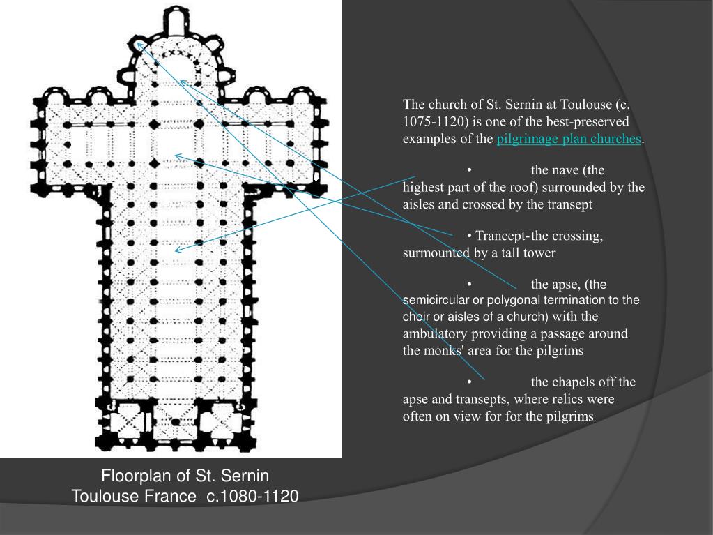 The church of St. Sernin at Toulouse (c. 1075-1120) is one of the best-preserved examples of the pilgrimage plan churches. • the nave (the highest part of the roof) surrounded by the aisles and crossed by the transept • Trancept- the crossing, surmounted by a tall tower • the apse, (the semicircular or polygonal termination to the choir or aisles of a church) with the ambulatory providing a passage around the monks' area for the pilgrims • the chapels off the apse and transepts, where relics were often on view for for the pilgrims Floorplan of St. Sernin Toulouse France c.1080-1120