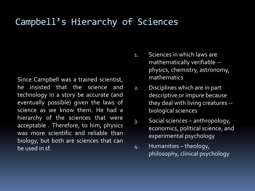 Campbell’s Hierarchy of Sciences Since Campbell was a trained scientist, he insisted that the science and technology in a story be accurate (and eventually possible) given the laws of science as we know them. He had a hierarchy of the sciences that were acceptable . Therefore, to him, physics was more scientific and reliable than biology, but both are sciences that can be used in sf. • Sciences in which laws are mathematically verifiable -- physics, chemistry, astronomy, mathematics • Disciplines which are in part descriptive or impure because they deal with living creatures -- biological sciences • Social sciences – anthropology, economics, political science, and experimental psychology • Humanities – theology, philosophy, clinical psychology