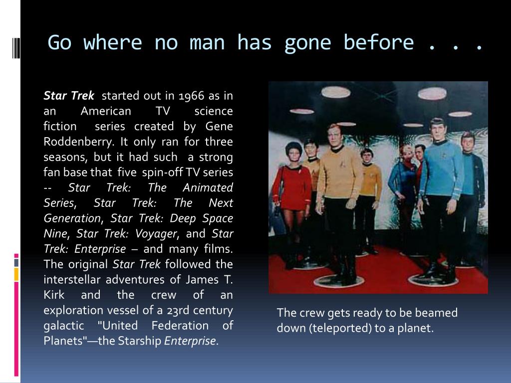 Go where no man has gone before . . . Star Trek started out in 1966 as in an American TV science fiction series created by Gene Roddenberry. It only ran for three seasons, but it had such a strong fan base that five spin-off TV series -- Star Trek: The Animated Series, Star Trek: The Next Generation, Star Trek: Deep Space Nine, Star Trek: Voyager, and Star Trek: Enterprise– and many films. The original Star Trek followed the interstellar adventures of James T. Kirk and the crew of an exploration vessel of a 23rd century galactic "United Federation of Planets"—the Starship Enterprise. The crew gets ready to be beamed down (teleported) to a planet.
