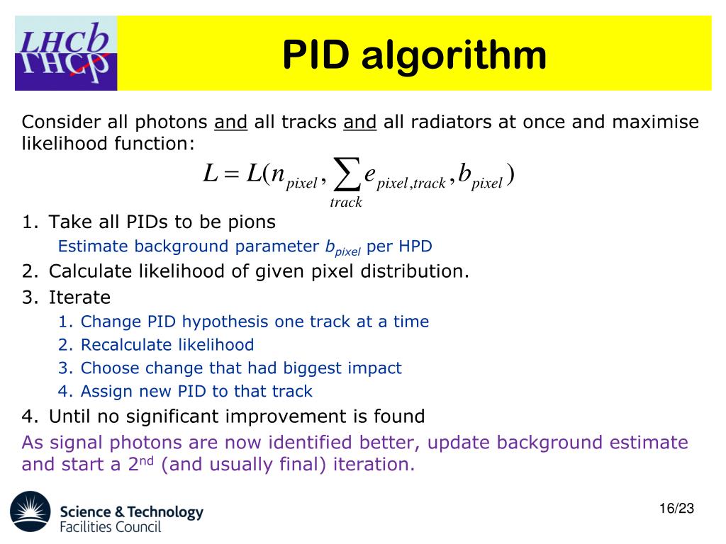 PID algorithm Consider all photons and all tracks and all radiators at once and maximise likelihood function: • Take all PIDs to be pions Estimate background parameter bpixel per HPD • Calculate likelihood of given pixel distribution. • Iterate • Change PID hypothesis one track at a time • Recalculate likelihood • Choose change that had biggest impact • Assign new PID to that track • Until no significant improvement is found As signal photons are now identified better, update background estimate and start a 2nd (and usually final) iteration.