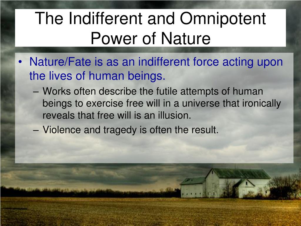 The Indifferent and Omnipotent Power of Nature • Nature/Fate is as an indifferent force acting upon the lives of human beings. • Works often describe the futile attempts of human beings to exercise free will in a universe that ironically reveals that free will is an illusion. • Violence and tragedy is often the result.