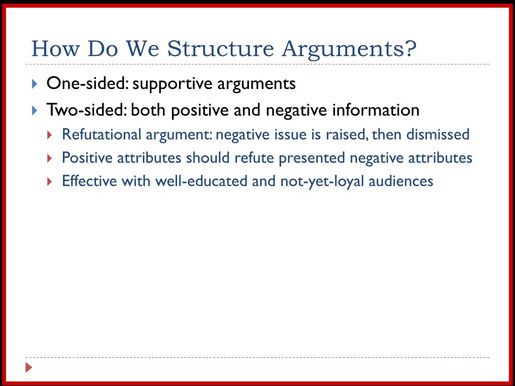 How Do We Structure Arguments? • One-sided: supportive arguments • Two-sided: both positive and negative information • Refutational argument: negative issue is raised, then dismissed • Positive attributes should refute presented negative attributes • Effective with well-educated and not-yet-loyal audiences