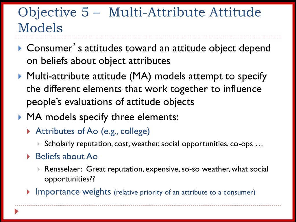 Objective 5 – Multi-Attribute Attitude Models • Consumer’s attitudes toward an attitude object depend on beliefs about object attributes • Multi-attribute attitude (MA) models attempt to specify the different elements that work together to influence people’s evaluations of attitude objects • MA models specify three elements: • Attributes of Ao (e.g., college) • Scholarly reputation, cost, weather, social opportunities, co-ops … • Beliefs about Ao • Rensselaer: Great reputation, expensive, so-so weather, what social opportunities?? • Importance weights (relative priority of an attribute to a consumer)