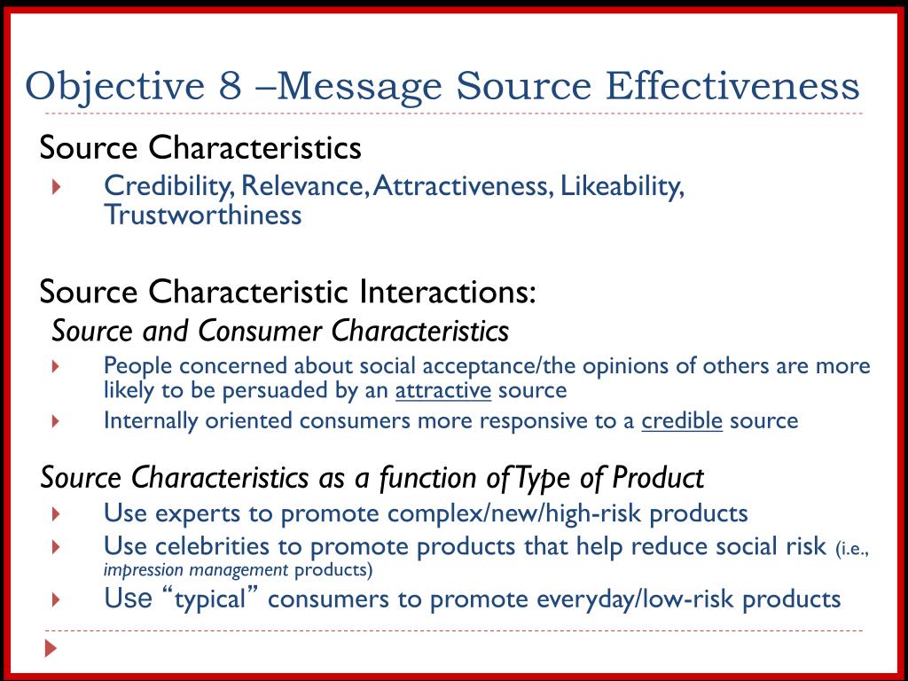 Objective 8 –Message Source Effectiveness • Source Characteristics • Credibility, Relevance, Attractiveness, Likeability, Trustworthiness • Source Characteristic Interactions: Source and Consumer Characteristics • People concerned about social acceptance/the opinions of others are more likely to be persuaded by an attractive source • Internally oriented consumers more responsive to a credible source Source Characteristics as a function of Type of Product • Use experts to promote complex/new/high-risk products • Use celebrities to promote products that help reduce social risk (i.e., impressionmanagement products) • Use “typical” consumers to promote everyday/low-risk products