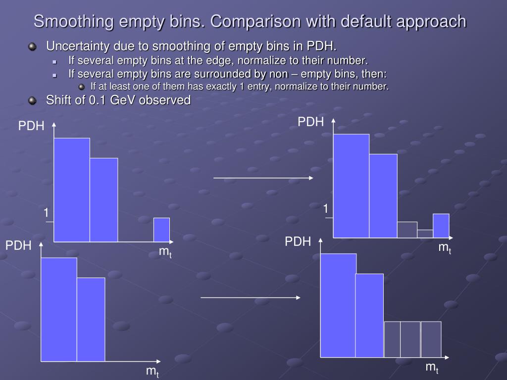 Smoothing empty bins. Comparison with default approach • Uncertainty due to smoothing of empty bins in PDH. • If several empty bins at the edge, normalize to their number. • If several empty bins are surrounded by non – empty bins, then: • If at least one of them has exactly 1 entry, normalize to their number. • Shift of 0.1 GeV observed PDH PDH 1 1 PDH PDH mt mt mt mt