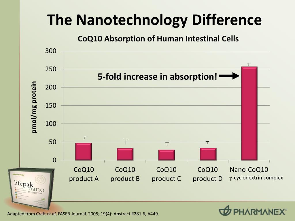 What Does “Nano” mean? Difficult to absorb nutrient (example: CoQ10) Nano-capsule Nano-nutrient = The application of nanotechnology employed by Pharmanex is a mono-molecular encapsulation where single molecules of important nutrients are embedded into single nano-capsule molecules. Since every single molecule of each nanoized-nutrient is wrapped in its own individual nano-capsule there is complete molecular dispersion of these fat-soluble nutrients in the water soluble environment of the digestive system.