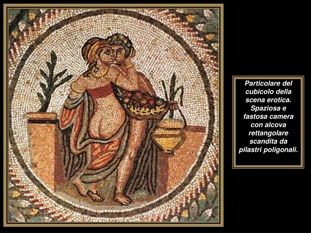 Particolare del cubicolo della scena erotica. Spaziosa e fastosa camera con alcova rettangolare scandita da pilastri poligonali.