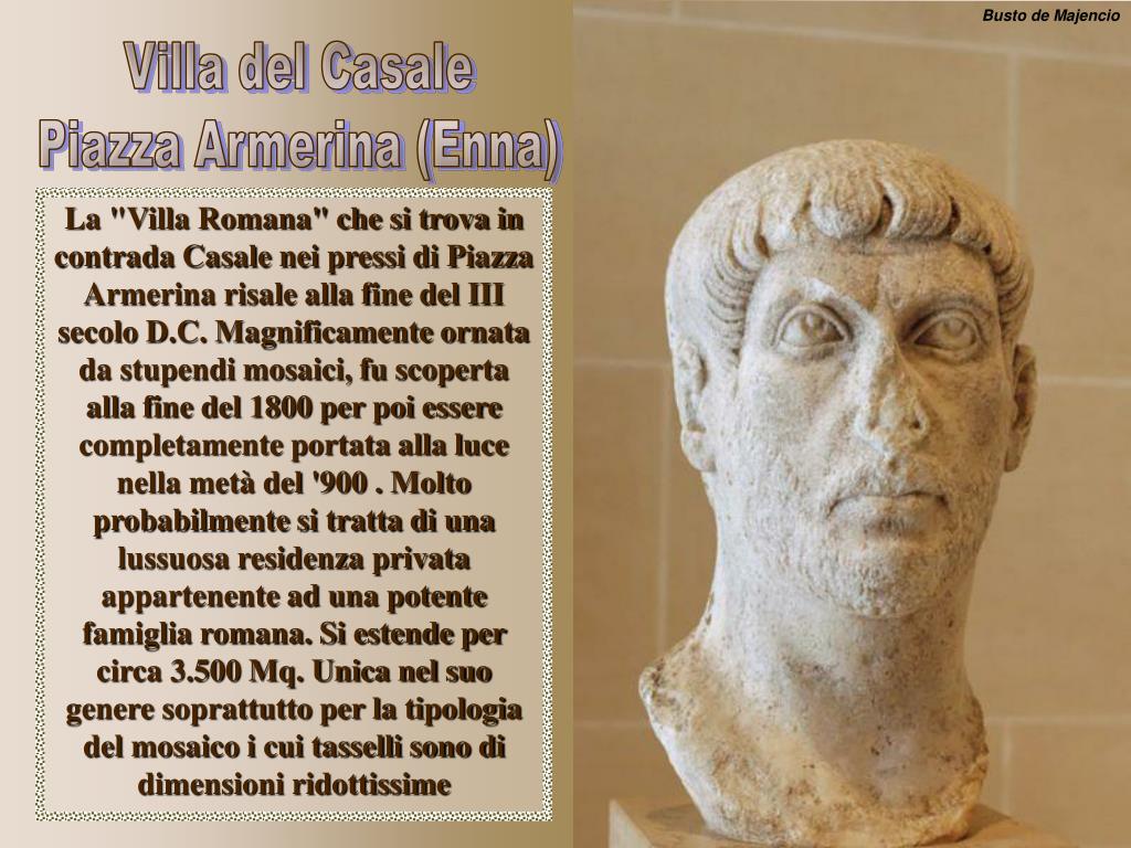 Busto de Majencio Villa del Casale Piazza Armerina (Enna) La "Villa Romana" che si trova in contrada Casale nei pressi di Piazza Armerina risale alla fine del III secolo D.C. Magnificamente ornata da stupendi mosaici, fu scoperta alla fine del 1800 per poi essere completamente portata alla luce nella metà del '900 . Molto probabilmente si tratta di una lussuosa residenza privata appartenente ad una potente famiglia romana. Si estende per circa 3.500 Mq. Unica nel suo genere soprattutto per la tipologia del mosaico i cui tasselli sono di dimensioni ridottissime