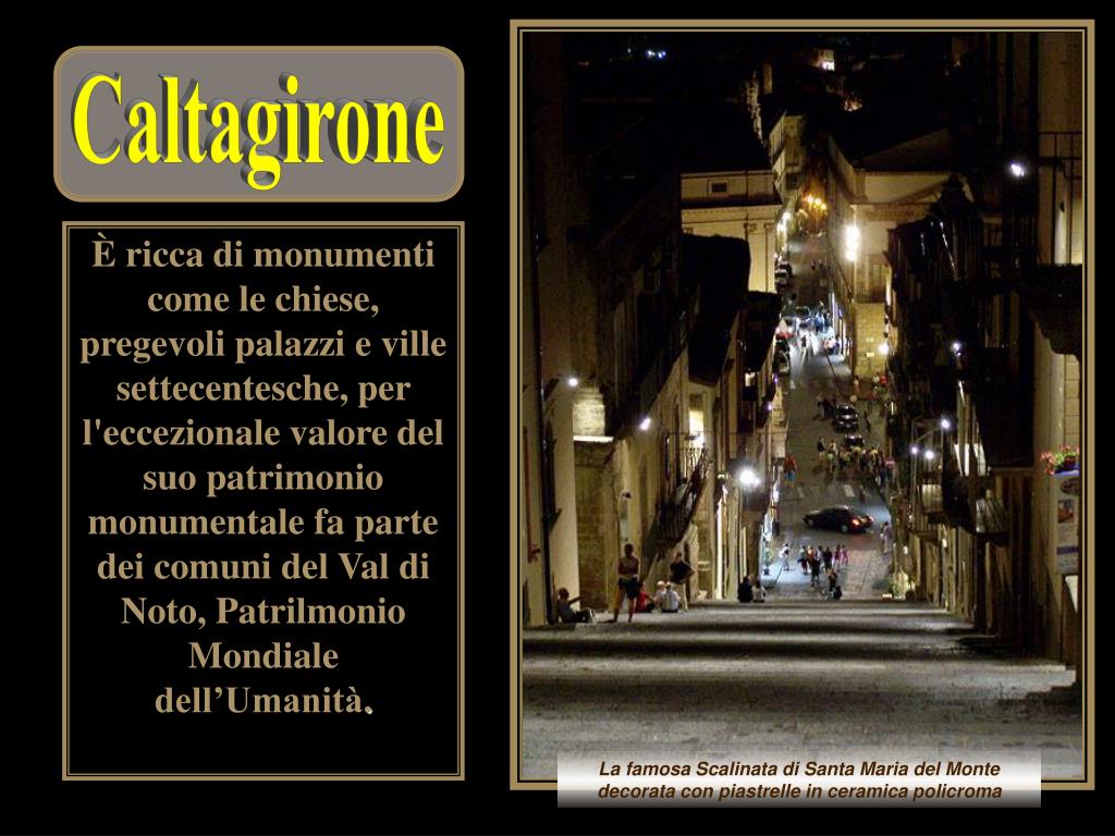 Caltagirone È ricca di monumenti come le chiese, pregevoli palazzi e ville settecentesche, per l'eccezionale valore del suo patrimonio monumentale fa parte dei comuni del Val di Noto, Patrilmonio Mondiale dell’Umanità. La famosa Scalinata di Santa Maria del Monte decorata con piastrelle in ceramica policroma