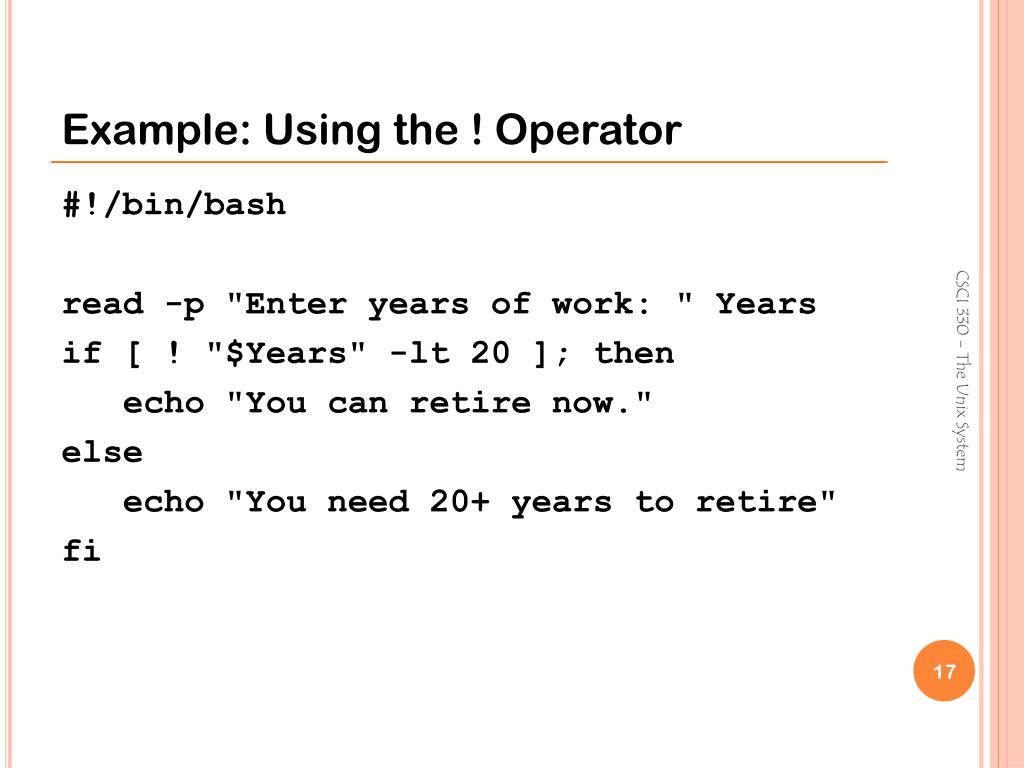 Example: Using the ! Operator #!/bin/bash read -p "Enter years of work: " Years if [ ! "$Years" -lt 20 ]; then echo "You can retire now." else echo "You need 20+ years to retire" fi CSCI 330 - The Unix System