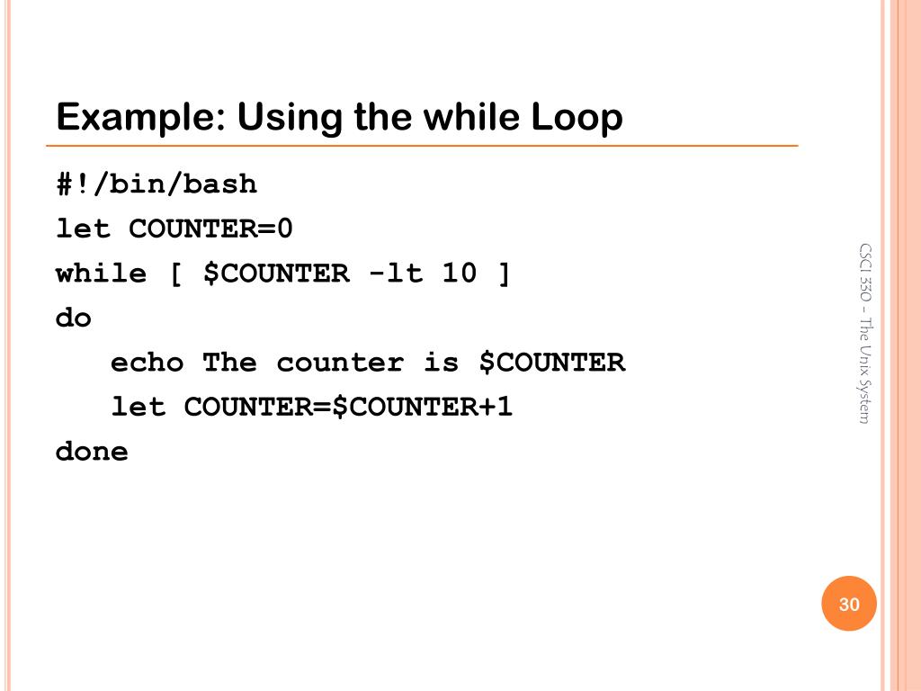 Example: Using the while Loop #!/bin/bash let COUNTER=0 while [ $COUNTER -lt 10 ] do echo The counter is $COUNTER let COUNTER=$COUNTER+1 done CSCI 330 - The Unix System