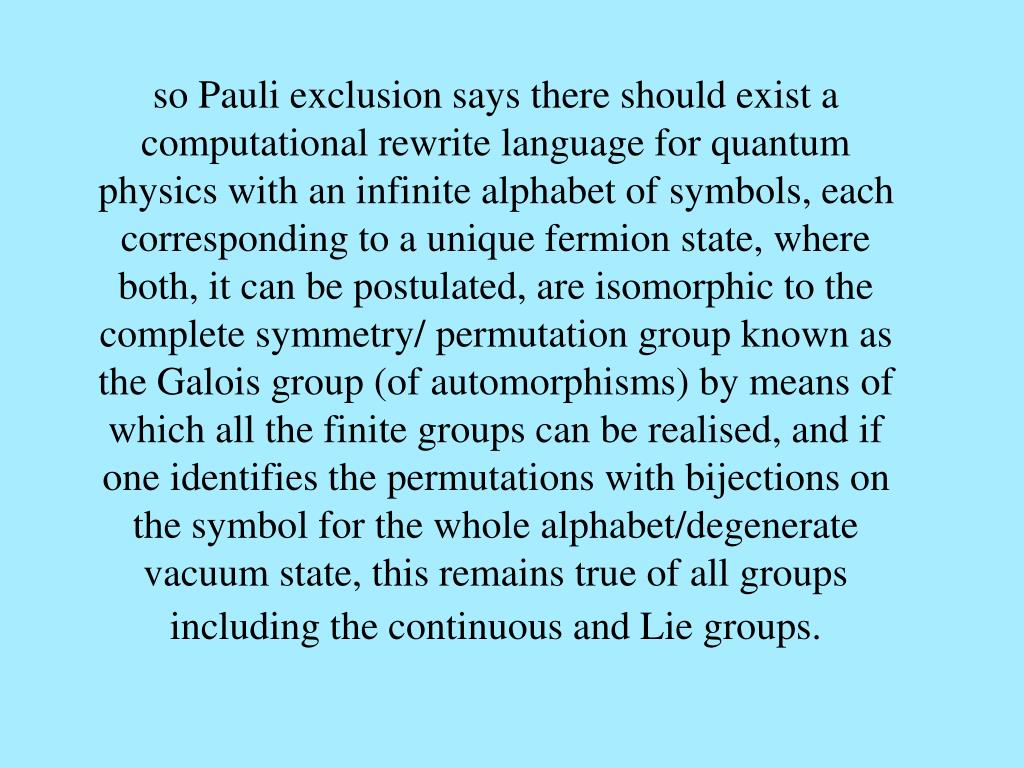 so Pauli exclusion says there should exist a computational rewrite language for quantum physics with an infinite alphabet of symbols, each corresponding to a unique fermion state, where both, it can be postulated, are isomorphic to the complete symmetry/ permutation group known as the Galois group (of automorphisms) by means of which all the finite groups can be realised, and if one identifies the permutations with bijections on the symbol for the whole alphabet/degenerate vacuum state, this remains true of all groups including the continuous and Lie groups.
