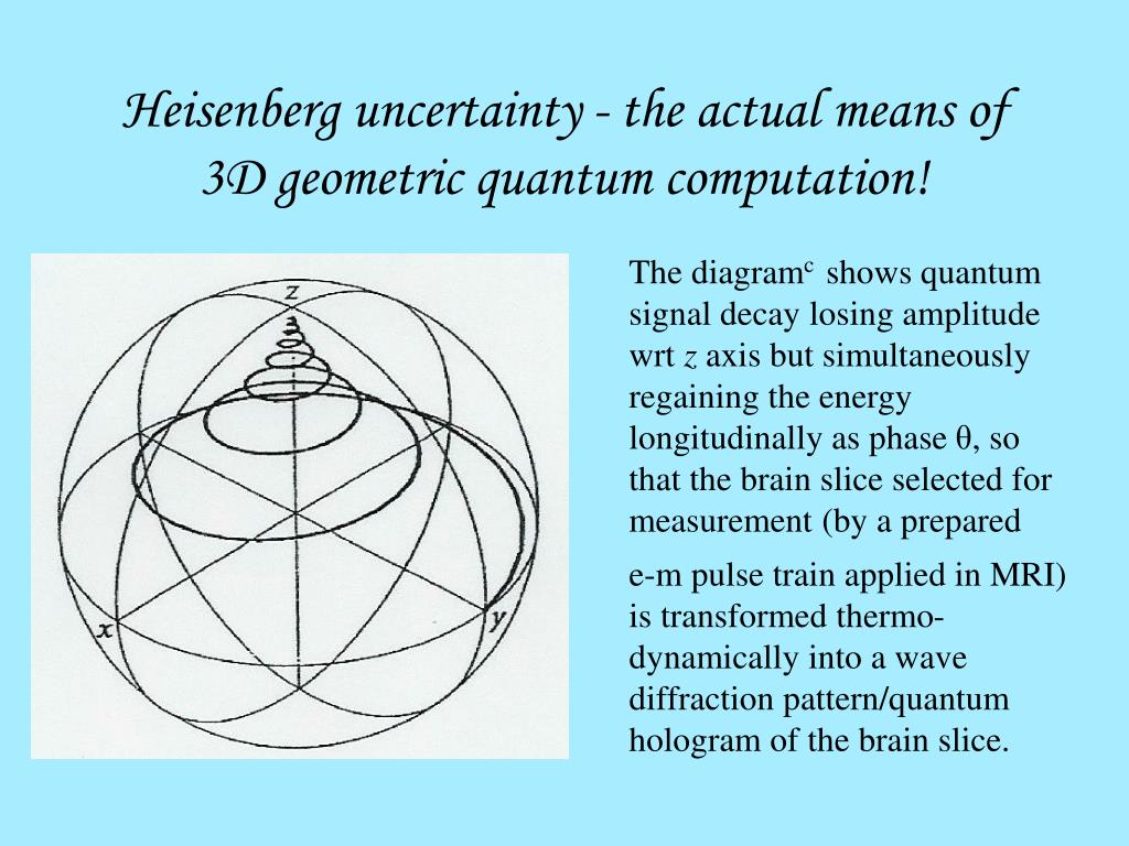 Heisenberg uncertainty - the actual means of 3D geometric quantum computation! The diagramc shows quantum signal decay losing amplitude wrt z axis but simultaneously regaining the energy longitudinally as phase θ, so that the brain slice selected for measurement (by a prepared e-m pulse train applied in MRI) is transformed thermo-dynamically into a wave diffraction pattern/quantum hologram of the brain slice.