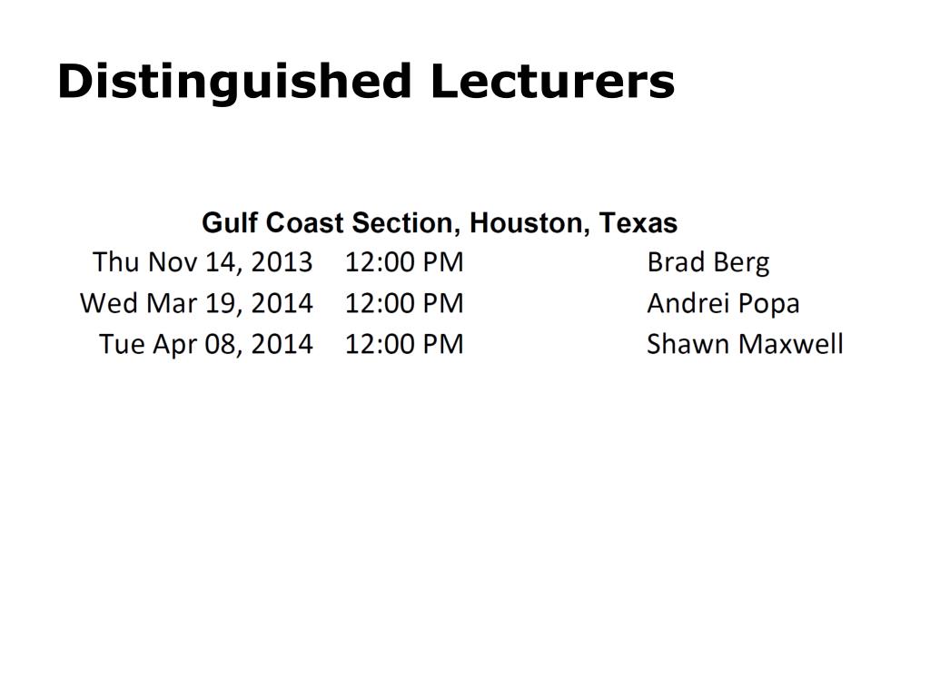 Planning • Define your program goals • Line up your speakers well in advance • Provide program data in time to be on the websites, included in email blasts and in the monthly newsletter • Establish a backup plan for missing speakers: • Prepared presentation by study group member • Existing ATCE presentations • Existing TIG group presentations • Minimize clustering your programs on same or near same day with other study groups • Make use of the Distinguished Lecturer Series • Advertise your meetings as much as possible and within the SPE guidelines