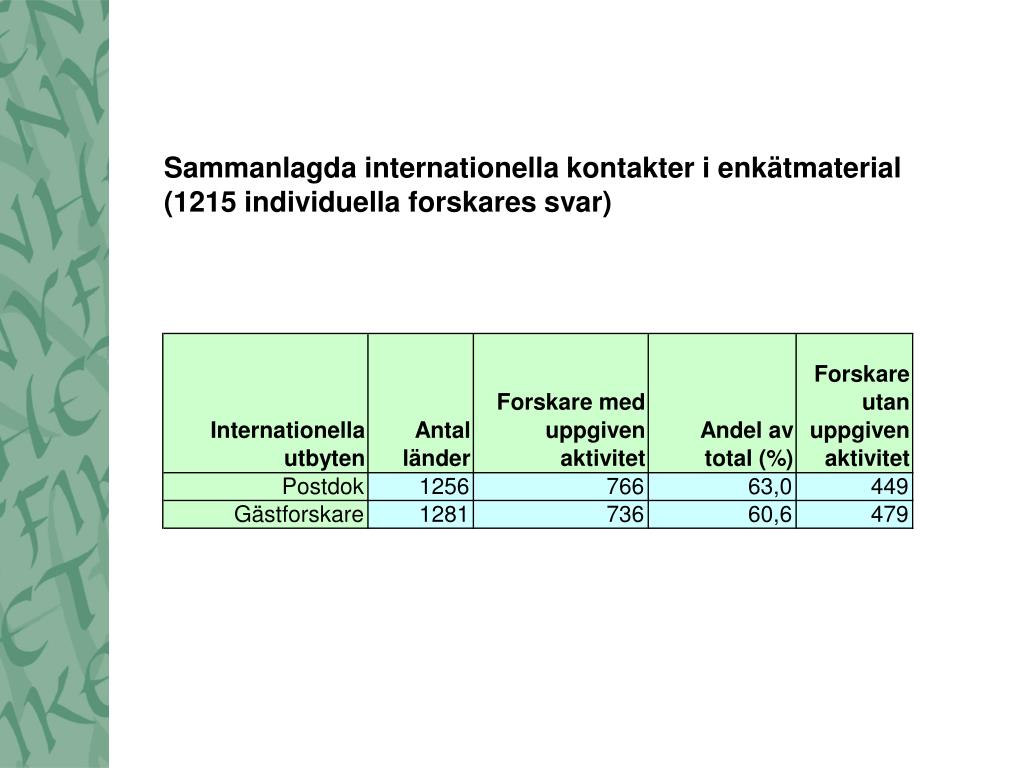 Sammanlagda internationella kontakter i enkätmaterial (1215 individuella forskares svar)