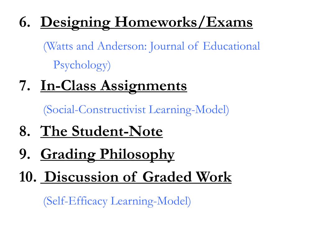 Designing Homeworks/Exams (Watts and Anderson: Journal of Educational Psychology) • In-Class Assignments (Social-Constructivist Learning-Model) • The Student-Note • Grading Philosophy • Discussion of Graded Work (Self-Efficacy Learning-Model)