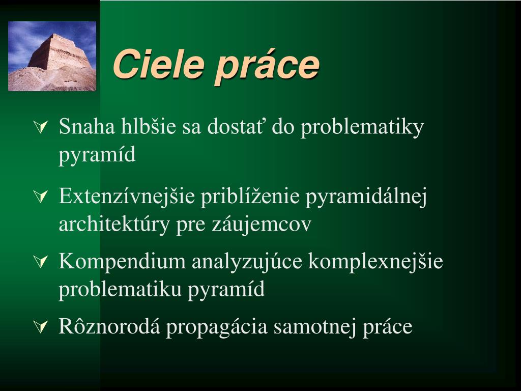 Ciele práce • Snaha hlbšie sa dostať do problematiky pyramíd • Extenzívnejšie priblíženie pyramidálnej architektúry pre záujemcov • Kompendium analyzujúce komplexnejšie problematiku pyramíd • Rôznorodá propagácia samotnej práce