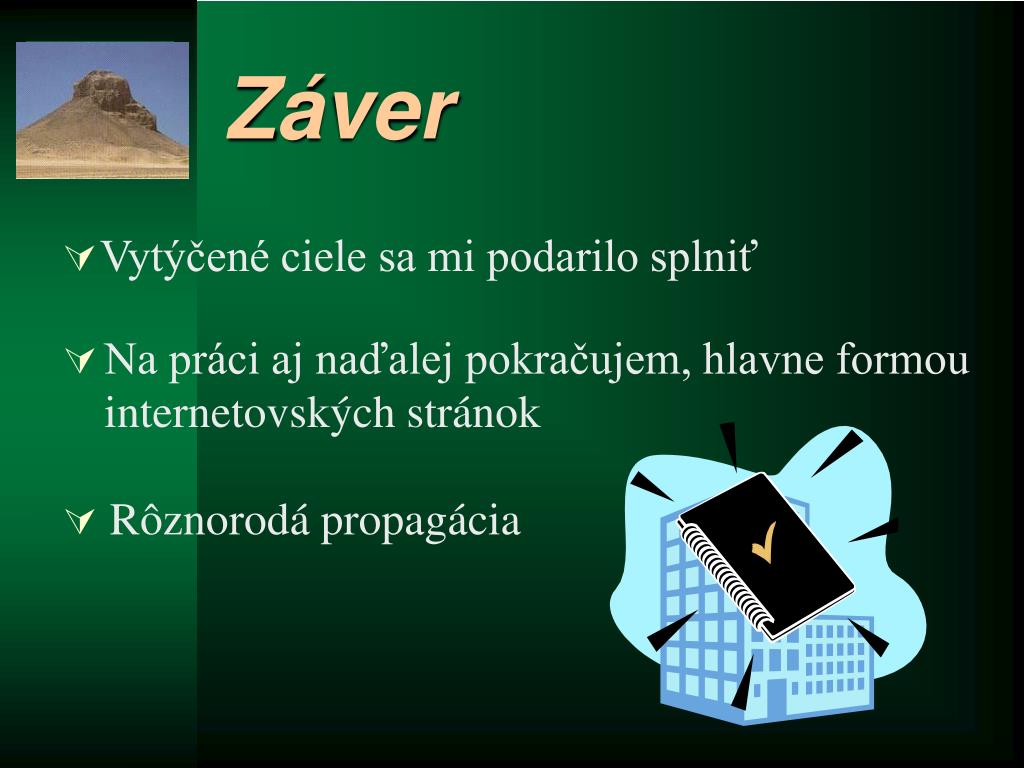 Záver • Vytýčené ciele sa mi podarilo splniť • Na práci aj naďalej pokračujem, hlavne formou internetovských stránok • Rôznorodá propagácia