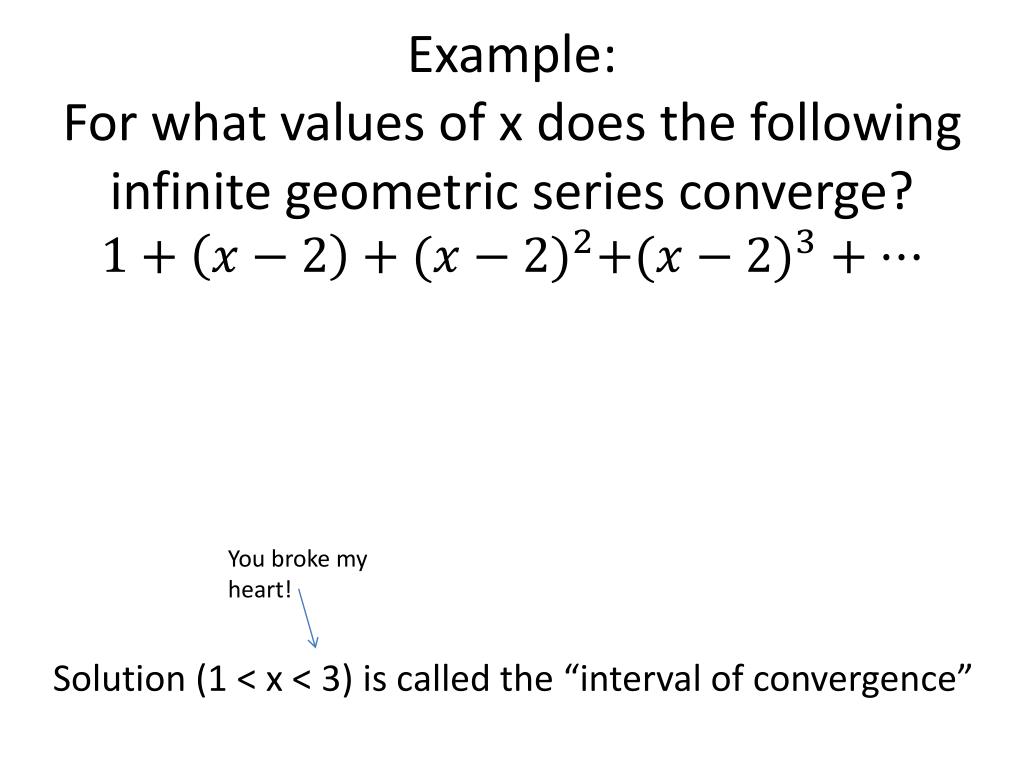 Example: For what values of x does the following infinite geometric series converge? You broke my heart! Solution (1 < x < 3) is called the “interval of convergence”