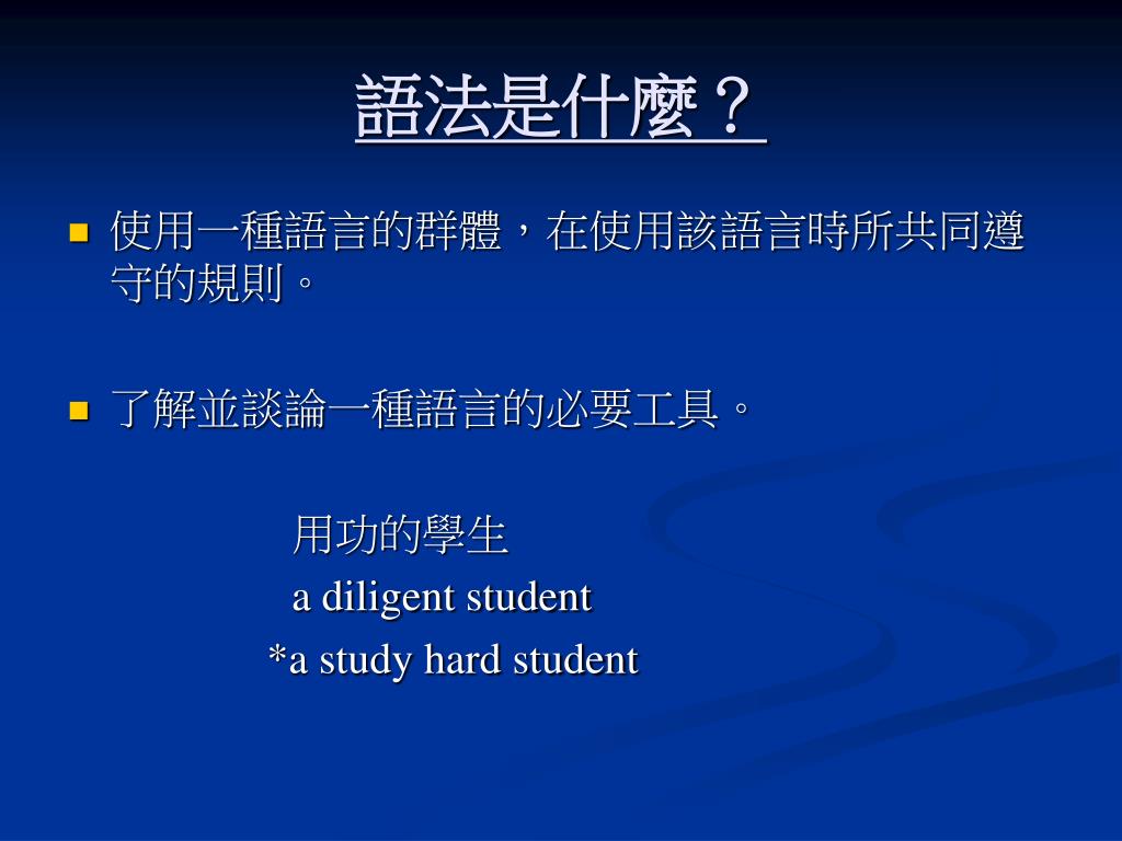 語法是什麼? • 使用一種語言的群體,在使用該語言時所共同遵守的規則。 • 了解並談論一種語言的必要工具。 用功的學生 a diligent student *a study hard student