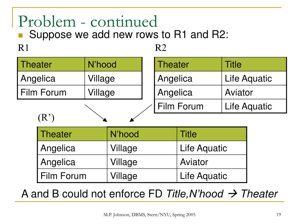 (R’) Theater N’hood Title Angelica Village Life Aquatic Angelica Village Aviator Film Forum Village Life Aquatic Problem - continued • Suppose we add new rows to R1 and R2: • Their join: R1 R2 A and B could not enforce FD Title,N’hood Theater M.P. Johnson, DBMS, Stern/NYU, Spring 2005