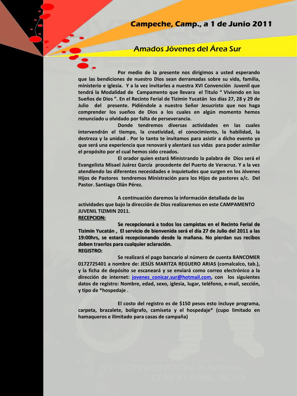 Campeche, Camp., a 1 de Junio 2011 Amados Jóvenes del Área Sur Por medio de la presente nos dirigimos a usted esperando que las bendiciones de nuestro Dios sean derramadas sobre su vida, familia, ministerio e iglesia. Y a la vez invitarles a nuestra XVI Convención Juvenil que tendrá la Modalidad de Campamento que llevara el Titulo “ Viviendo en los Sueños de Dios ”. En el Recinto Ferial de Tizimin Yucatán los días 27, 28 y 29 de Julio del presente. Pidiéndole a nuestro Señor Jesucristo que nos haga comprender los sueños de Dios a los cuales en algún momento hemos renunciado u olvidado por falta de perseverancia. Donde tendremos diversas actividades en las cuales intervendrán el tiempo, la creatividad, el conocimiento, la habilidad, la destreza y la unidad . Por lo tanto te invitamos para asistir a dicho evento ya que será una experiencia que renovará y alentará sus vidas para poder asimilar el propósito por el cual hemos sido creados. El orador quien estará Ministrando la palabra de Dios será el Evangelista Misael Juárez García procedente del Puerto de Veracruz. Y a la vez atendiendo las diferentes necesidades e inquietudes que surgen en los Jóvenes Hijos de Pastores tendremos Ministración para los Hijos de pastores a/c. Del Pastor. Santiago Olán Pérez. A continuación daremos la información detallada de las actividades que bajo la dirección de Dios realizaremos en este CAMPAMENTO JUVENIL TIZIMIN 2011. RECEPCION: Se recepcionará a todos los campistas en el Recinto Ferial de Tizimin Yucatán , El servicio de bienvenida será el día 27 de Julio del 2011 a las 19:00hrs, se estará recepcionando desde la mañana. No pierdan sus recibos deben traerlos para cualquier aclaración. REGISTRO: Se realizará el pago bancario al número de cuenta BANCOMER 0172725401 a nombre de: JESÚS MARITZA REGUERO ARIAS (comalcalco, tab.), y la ficha de depósito se escaneará y se enviará como correo electrónico a la dirección de internet: jovenes_conicar.sur@hotmail.com, con los siguientes datos de registro: Nombre, edad, sexo, iglesia, lugar, teléfono, e-mail, sección, y tipo de *hospedaje . El costo del registro es de $150 pesos esto incluye programa, carpeta, brazalete, bolígrafo, camiseta y el hospedaje* (cupo limitado en hamaqueros e ilimitado para casas de campaña)
