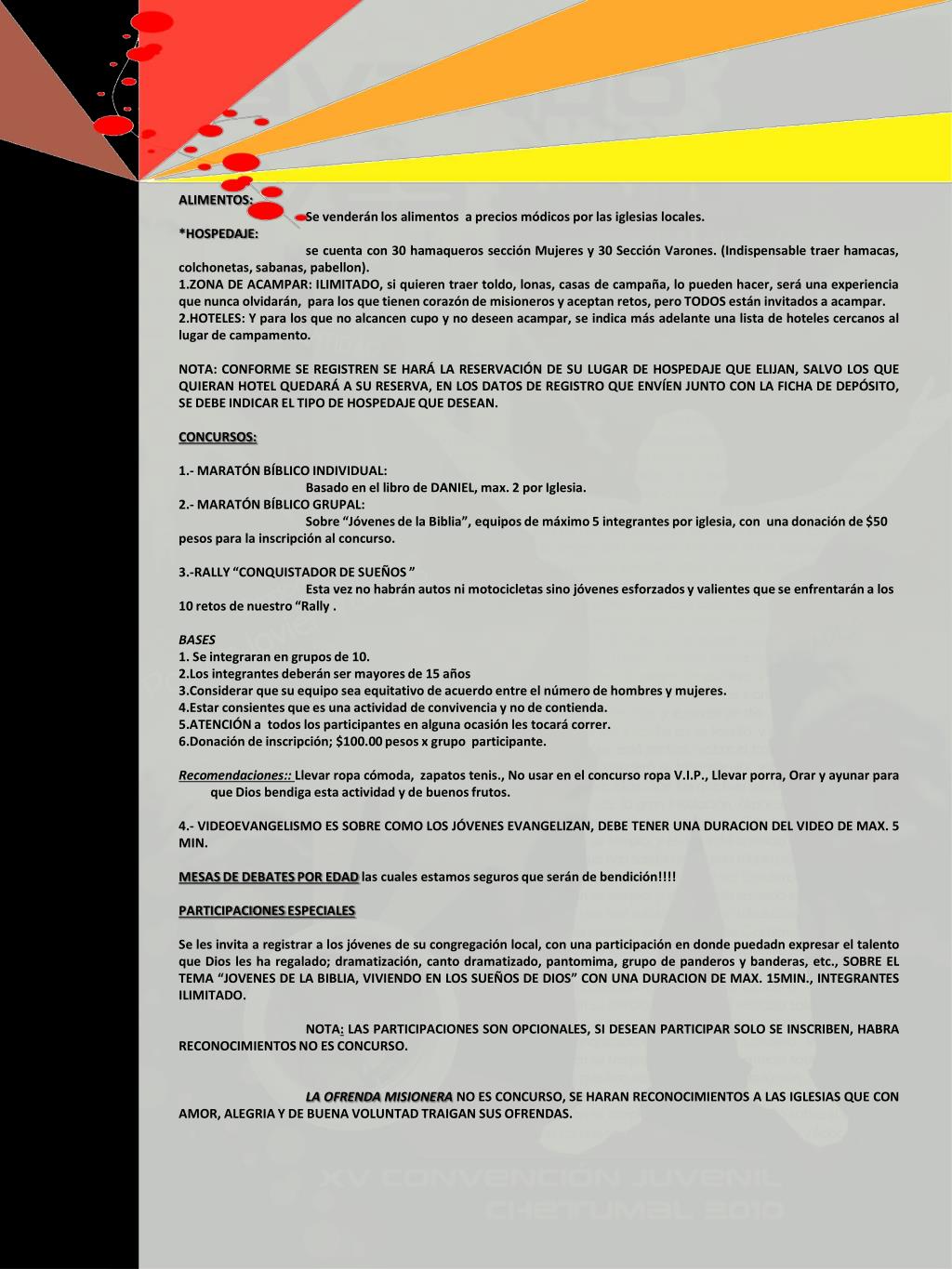 ALIMENTOS: Se venderán los alimentos a precios módicos por las iglesias locales. *HOSPEDAJE: se cuenta con 30 hamaqueros sección Mujeres y 30 Sección Varones. (Indispensable traer hamacas, colchonetas, sabanas, pabellon). ZONA DE ACAMPAR: ILIMITADO, si quieren traer toldo, lonas, casas de campaña, lo pueden hacer, será una experiencia que nunca olvidarán, para los que tienen corazón de misioneros y aceptan retos, pero TODOS están invitados a acampar. HOTELES: Y para los que no alcancen cupo y no deseen acampar, se indica más adelante una lista de hoteles cercanos al lugar de campamento. NOTA: CONFORME SE REGISTREN SE HARÁ LA RESERVACIÓN DE SU LUGAR DE HOSPEDAJE QUE ELIJAN, SALVO LOS QUE QUIERAN HOTEL QUEDARÁ A SU RESERVA, EN LOS DATOS DE REGISTRO QUE ENVÍEN JUNTO CON LA FICHA DE DEPÓSITO, SE DEBE INDICAR EL TIPO DE HOSPEDAJE QUE DESEAN. CONCURSOS: 1.- MARATÓN BÍBLICO INDIVIDUAL: Basado en el libro de DANIEL, max. 2 por Iglesia. 2.- MARATÓN BÍBLICO GRUPAL: Sobre “Jóvenes de la Biblia”, equipos de máximo 5 integrantes por iglesia, con una donación de $50 pesos para la inscripción al concurso. 3.-RALLY “CONQUISTADOR DE SUEÑOS ” Esta vez no habrán autos ni motocicletas sino jóvenes esforzados y valientes que se enfrentarán a los 10 retos de nuestro “Rally . BASES 1. Se integraran en grupos de 10. Los integrantes deberán ser mayores de 15 años Considerar que su equipo sea equitativo de acuerdo entre el número de hombres y mujeres. Estar consientes que es una actividad de convivencia y no de contienda. ATENCIÓN a todos los participantes en alguna ocasión les tocará correr. Donación de inscripción; $100.00 pesos x grupo participante. Recomendaciones:: Llevar ropa cómoda, zapatos tenis., No usar en el concurso ropa V.I.P., Llevar porra, Orar y ayunar para que Dios bendiga esta actividad y de buenos frutos. 4.- VIDEOEVANGELISMO ES SOBRE COMO LOS JÓVENES EVANGELIZAN, DEBE TENER UNA DURACION DEL VIDEO DE MAX. 5 MIN. MESAS DE DEBATES POR EDAD las cuales estamos seguros que serán de bendición!!!! PARTICIPACIONES ESPECIALES Se les invita a registrar a los jóvenes de su congregación local, con una participación en donde puedadn expresar el talento que Dios les ha regalado; dramatización, canto dramatizado, pantomima, grupo de panderos y banderas, etc., SOBRE EL TEMA “JOVENES DE LA BIBLIA, VIVIENDO EN LOS SUEÑOS DE DIOS” CON UNA DURACION DE MAX. 15MIN., INTEGRANTES ILIMITADO. NOTA: LAS PARTICIPACIONES SON OPCIONALES, SI DESEAN PARTICIPAR SOLO SE INSCRIBEN, HABRA RECONOCIMIENTOS NO ES CONCURSO. LA OFRENDA MISIONERA NO ES CONCURSO, SE HARAN RECONOCIMIENTOS A LAS IGLESIAS QUE CON AMOR, ALEGRIA Y DE BUENA VOLUNTAD TRAIGAN SUS OFRENDAS.