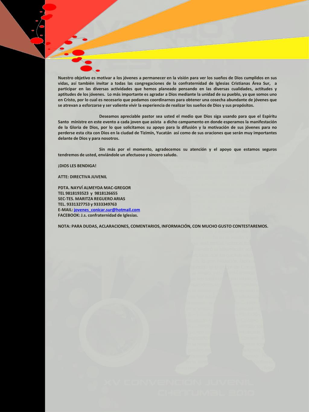 Nuestro objetivo es motivar a los jóvenes a permanecer en la visión para ver los sueños de Dios cumplidos en sus vidas, así también invitar a todas las congregaciones de la confraternidad de Iglesias Cristianas Área Sur, a participar en las diversas actividades que hemos planeado pensando en las diversas cualidades, actitudes y aptitudes de los jóvenes. Lo más importante es agradar a Dios mediante la unidad de su pueblo, ya que somos uno en Cristo, por lo cual es necesario que podamos coordinarnos para obtener una cosecha abundante de jóvenes que se atrevan a esforzarse y ser valiente vivir la experiencia de realizar los sueños de Dios y sus propósitos. Deseamos apreciable pastor sea usted el medio que Dios siga usando para que el Espíritu Santo ministre en este evento a cada joven que asista a dicho campamento en donde esperamos la manifestación de la Gloria de Dios, por lo que solicitamos su apoyo para la difusión y la motivación de sus jóvenes para no perderse esta cita con Dios en la ciudad de Tizimín, Yucatán así como de sus oraciones que serán muy importantes delante de Dios y para nosotros. Sin más por el momento, agradecemos su atención y el apoyo que estamos seguros tendremos de usted, enviándole un afectuoso y sincero saludo. ¡DIOS LES BENDIGA! ATTE: DIRECTIVA JUVENIL PDTA. NAYVÍ ALMEYDA MAC-GREGOR TEL 9818193523 y 9818126655 SEC-TES. MARITZA REGUERO ARIAS TEL. 9331327753 y 9333349763 E-MAIL: jovenes_conicar.sur@hotmail.com FACEBOOK: J.s. confraternidad de Iglesias. NOTA: PARA DUDAS, ACLARACIONES, COMENTARIOS, INFORMACIÓN, CON MUCHO GUSTO CONTESTAREMOS.