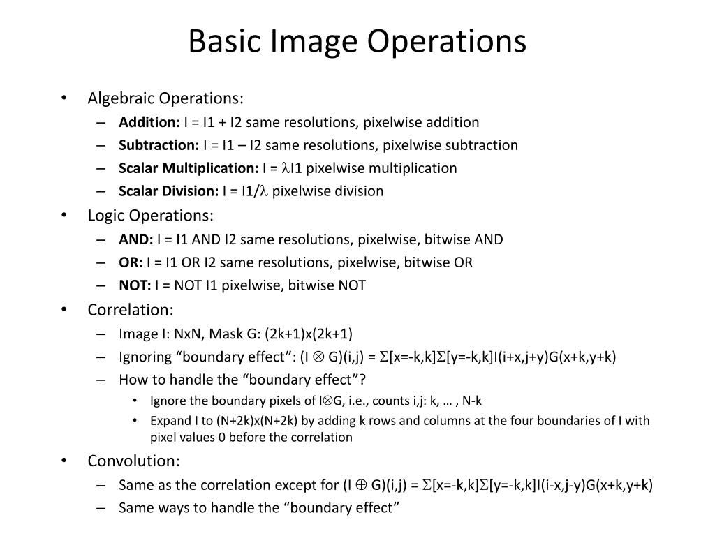 Basic Image Operations • Algebraic Operations: • Addition: I = I1 + I2 same resolutions, pixelwise addition • Subtraction: I = I1 – I2 same resolutions, pixelwise subtraction • Scalar Multiplication: I = I1 pixelwise multiplication • Scalar Division: I = I1/ pixelwise division • Logic Operations: • AND: I = I1 AND I2 same resolutions, pixelwise, bitwise AND • OR: I = I1 OR I2 same resolutions, pixelwise, bitwise OR • NOT: I = NOT I1 pixelwise, bitwise NOT • Correlation: • Image I: NxN, Mask G: (2k+1)x(2k+1) • Ignoring “boundary effect”: (I G)(i,j) = [x=-k,k][y=-k,k]I(i+x,j+y)G(x+k,y+k) • How to handle the “boundary effect”? • Ignore the boundary pixels of IG, i.e., counts i,j: k, … , N-k • Expand I to (N+2k)x(N+2k) by adding k rows and columns at the four boundaries of I with pixel values 0 before the correlation • Convolution: • Same as the correlation except for (I G)(i,j) = [x=-k,k][y=-k,k]I(i-x,j-y)G(x+k,y+k) • Same ways to handle the “boundary effect”