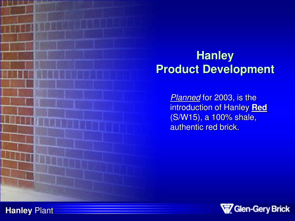 HanleyProduct Development Planned for 2003, is the introduction of Hanley Red (S/W15), a 100% shale,authentic red brick. Hanley Plant