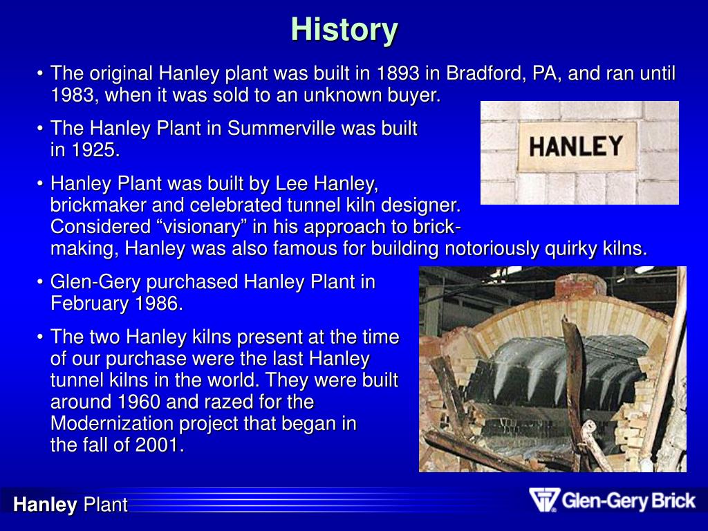 History • The original Hanley plant was built in 1893 in Bradford, PA, and ran until 1983, when it was sold to an unknown buyer. • The Hanley Plant in Summerville was builtin 1925. • Hanley Plant was built by Lee Hanley,brickmaker and celebrated tunnel kiln designer.Considered “visionary” in his approach to brick-making, Hanley was also famous for building notoriously quirky kilns. • Glen-Gery purchased Hanley Plant inFebruary 1986. • The two Hanley kilns present at the timeof our purchase were the last Hanleytunnel kilns in the world. They were builtaround 1960 and razed for theModernization project that began inthe fall of 2001. Hanley Plant