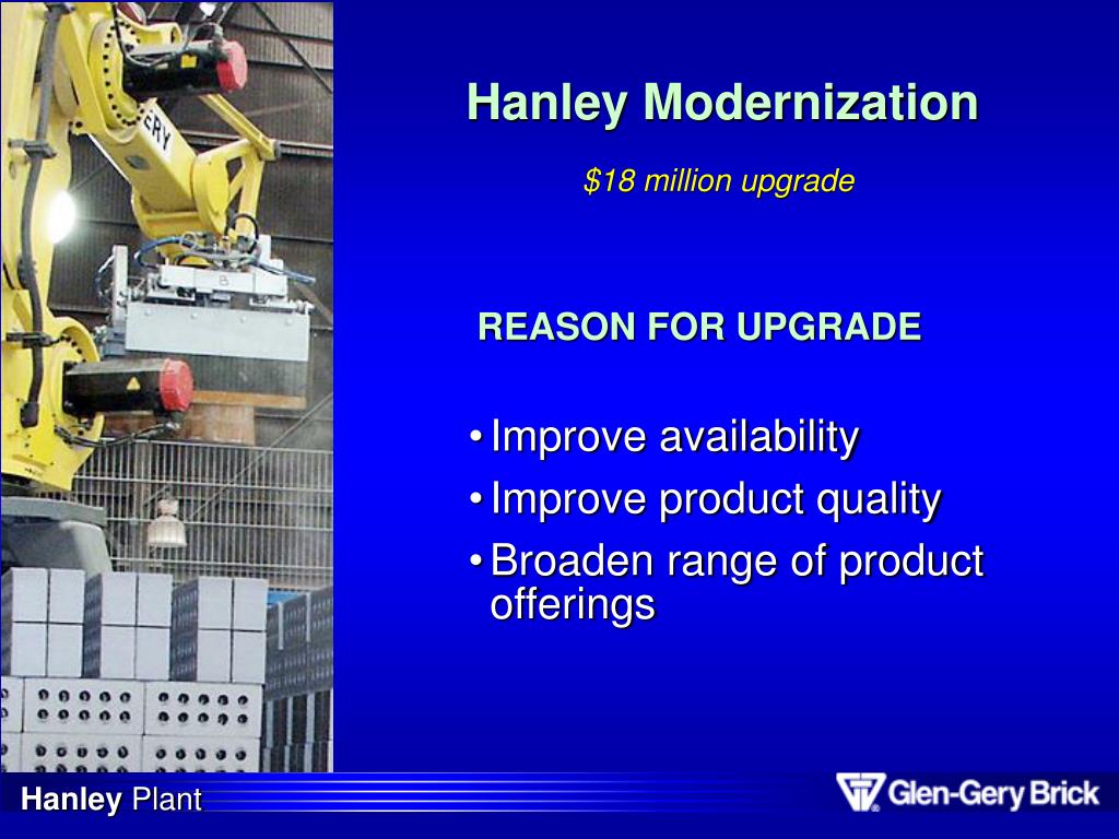 Hanley Modernization $18 million upgrade REASON FOR UPGRADE • Improve availability • Improve product quality • Broaden range of product offerings Hanley Plant