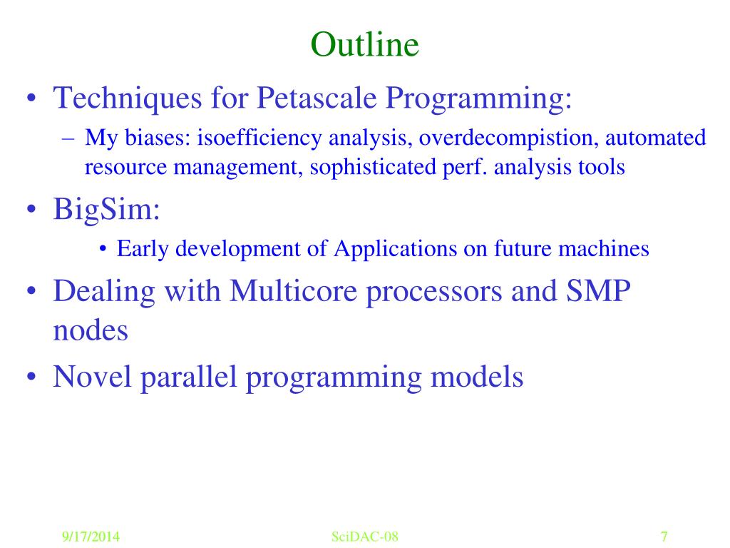 Outline • Techniques for Petascale Programming: • My biases: isoefficiency analysis, overdecompistion, automated resource management, sophisticated perf. analysis tools • BigSim: • Early development of Applications on future machines • Dealing with Multicore processors and SMP nodes • Novel parallel programming models 9/17/2014 SciDAC-08 7