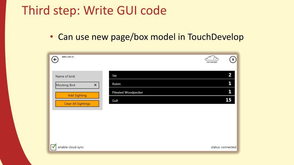 Third step: Write GUI code • Can use new page/box model in TouchDevelop