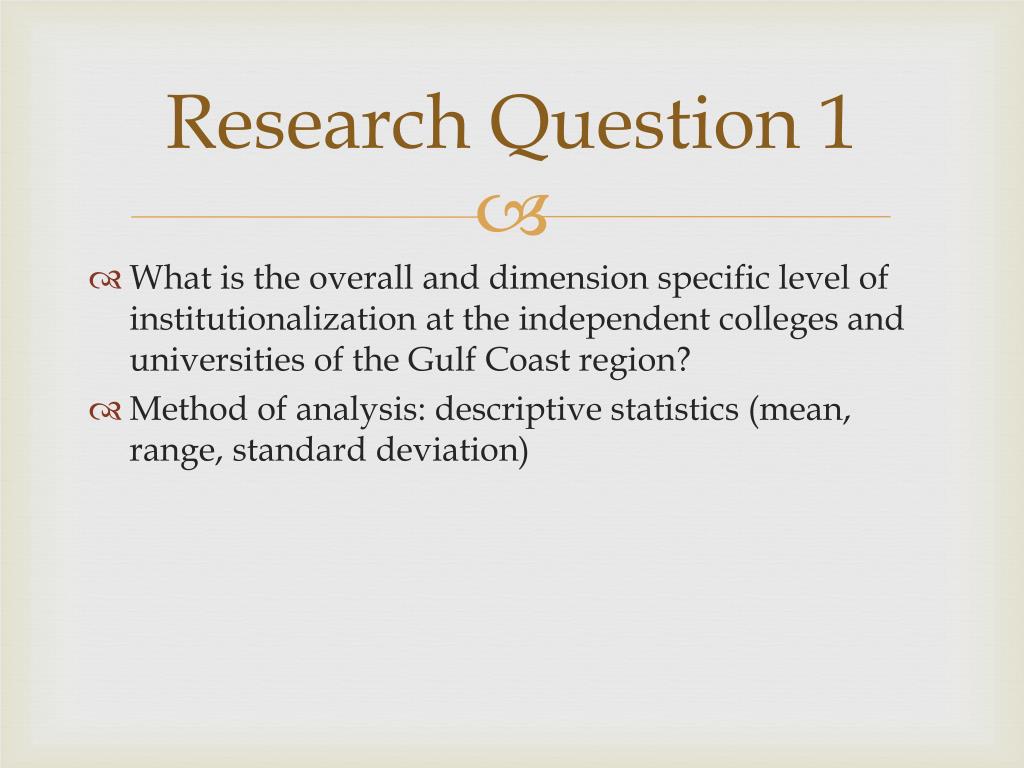 Research Question 1 • What is the overall and dimension specific level of institutionalization at the independent colleges and universities of the Gulf Coast region? • Method of analysis: descriptive statistics (mean, range, standard deviation)