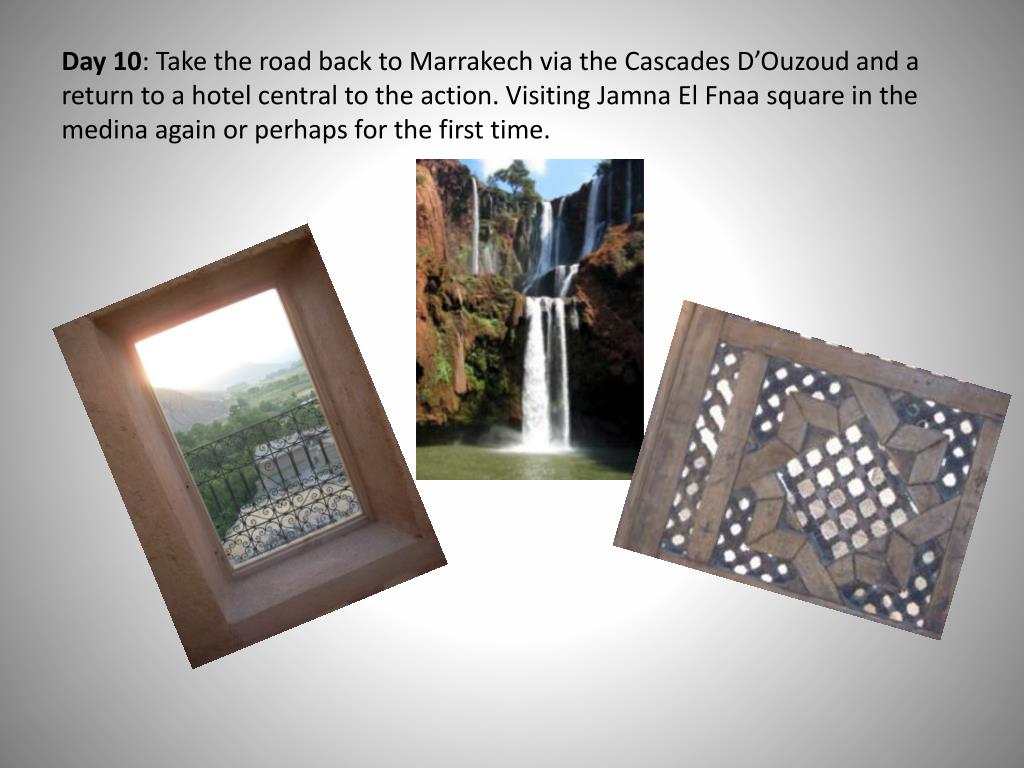 Day 10: Take the road back to Marrakech via the Cascades D’Ouzoud and a return to a hotel central to the action. Visiting Jamna El Fnaa square in the medina again or perhaps for the first time.