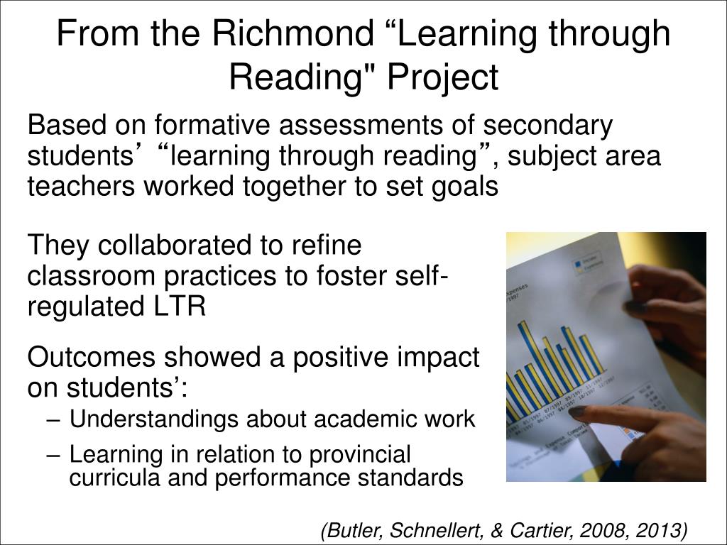 From the Richmond “Learning through Reading" Project Based on formative assessments of secondary students’“learning through reading”, subject area teachers worked together to set goals They collaborated to refine classroom practices to foster self-regulated LTR Outcomes showed a positive impact on students’: • Understandings about academic work • Learning in relation to provincial curricula and performance standards (Butler, Schnellert, & Cartier, 2008, 2013)