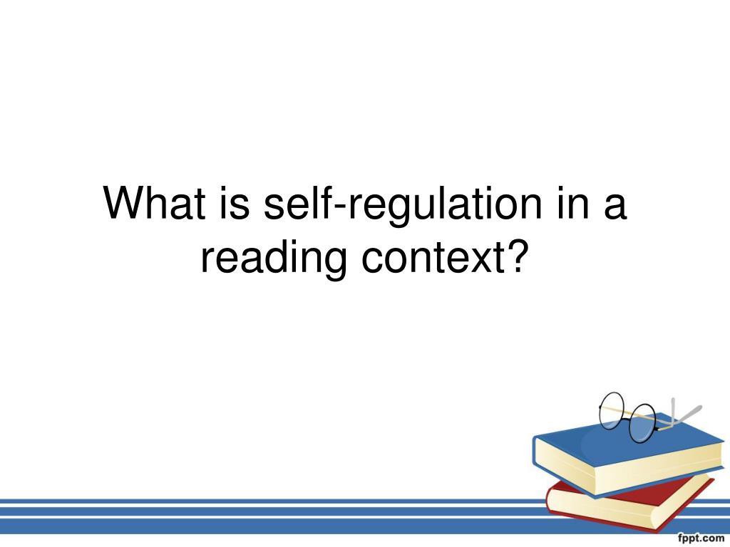What is Self-Regulated Learning in a Reading Context? Classic Definition of Self-Regulation: The ability to control thoughts and actions to achieve personal goals and respond to environmental demands (Zimmerman, 2008) Self-regulation is "active," strategic engagement Learners can take, and feel in control, over activities by deliberately and reflectively “self-regulating” learning
