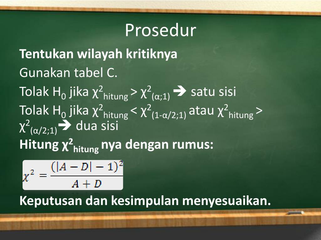 Prosedur Tentukan wilayah kritiknya Gunakan tabel C. Tolak H0 jika χ2hitung > χ2(α;1) satu sisi Tolak H0 jika χ2hitung < χ2(1-α/2;1) atau χ2hitung > χ2(α/2;1) dua sisi Hitung χ2hitung nya dengan rumus: Keputusan dan kesimpulan menyesuaikan.