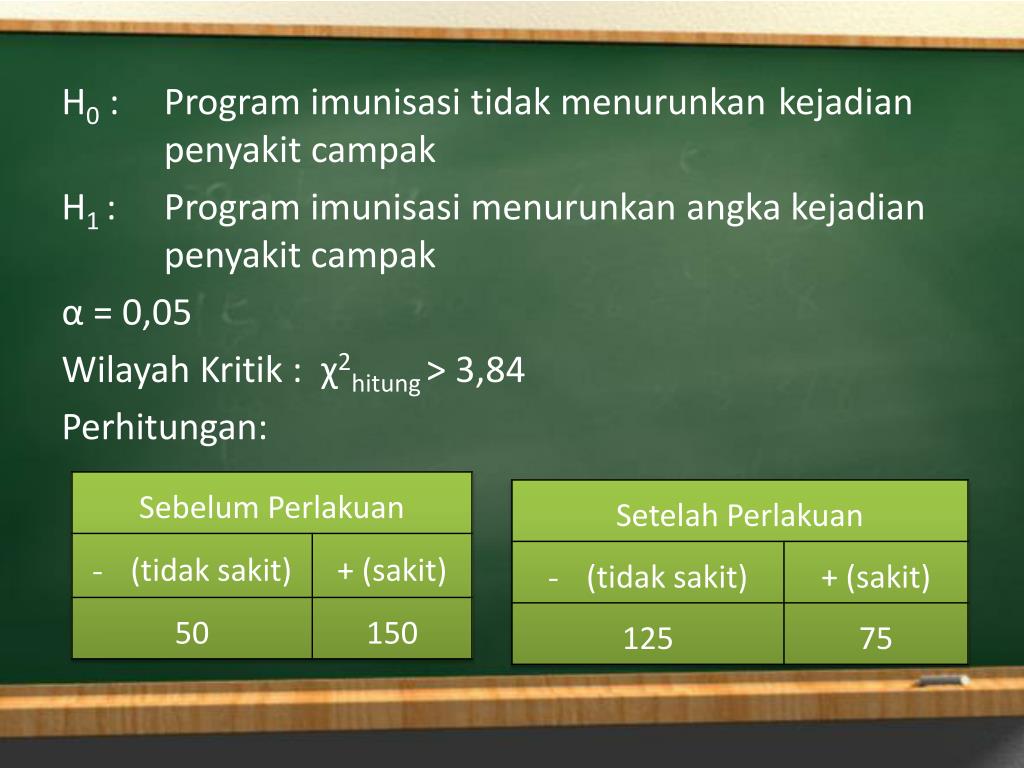Keputusan : Tolak H0 karena χ2hitung > 3,84 Kesimpulan : Dengan tingkat kepercayaan 95%, dapat disimpulkan bahwa program imunisasi ini menurunkan angka kejadian penyakit campak.