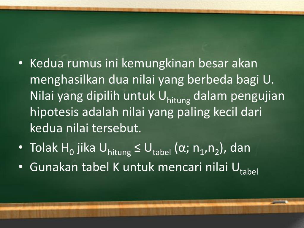 Keduarumusinikemungkinanbesarakanmenghasilkanduanilai yang berbedabagi U. Nilai yang dipilihuntuk Uhitungdalampengujianhipotesisadalahnilai yang paling kecildarikeduanilaitersebut. • Tolak H0 jika Uhitung ≤ Utabel (α; n1,n2), dan • Gunakan tabel K untuk mencari nilai Utabel