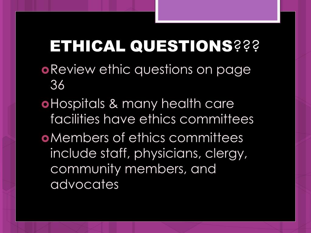 ETHICALQUESTIONS??? • Review ethic questions on page 36 • Hospitals & many health care facilities have ethics committees • Members of ethics committees include staff, physicians, clergy, community members, and advocates