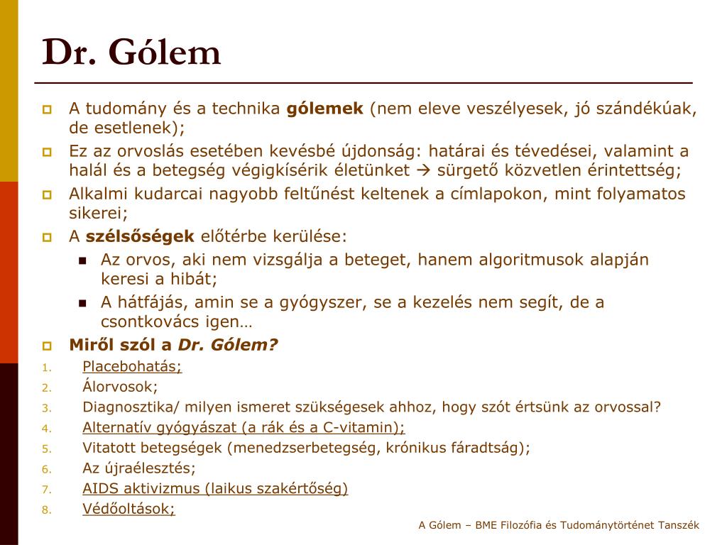 Dr. Gólem • A tudomány és a technika gólemek (nem eleve veszélyesek, jó szándékúak, de esetlenek); • Ez az orvoslás esetében kevésbé újdonság: határai és tévedései, valamint a halál és a betegség végigkísérik életünket sürgető közvetlen érintettség; • Alkalmi kudarcai nagyobb feltűnést keltenek a címlapokon, mint folyamatos sikerei; • A szélsőségek előtérbe kerülése: • Az orvos, aki nem vizsgálja a beteget, hanem algoritmusok alapján keresi a hibát; • A hátfájás, amin se a gyógyszer, se a kezelés nem segít, de a csontkovács igen… • Miről szól a Dr. Gólem? • Placebohatás; • Álorvosok; • Diagnosztika/ milyen ismeret szükségesek ahhoz, hogy szót értsünk az orvossal? • Alternatív gyógyászat (a rák és a C-vitamin); • Vitatott betegségek (menedzserbetegség, krónikus fáradtság); • Az újraélesztés; • AIDS aktivizmus (laikus szakértőség) • Védőoltások; A Gólem – BME Filozófia és Tudománytörténet Tanszék