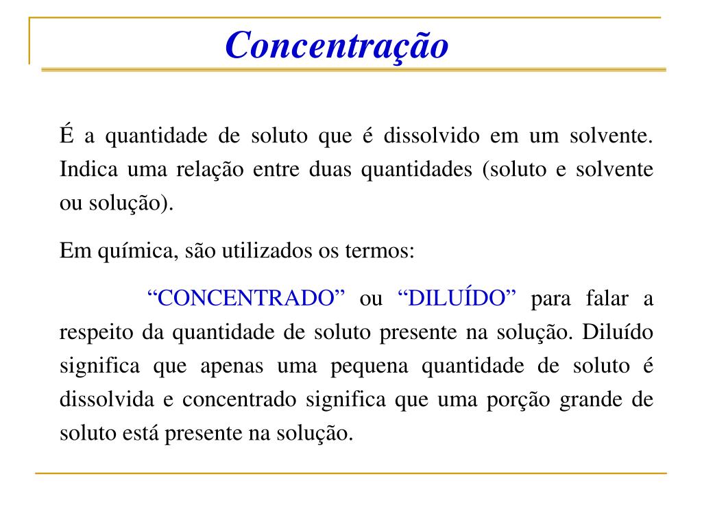 Concentração É a quantidade de soluto que é dissolvido em um solvente. Indica uma relação entre duas quantidades (soluto e solvente ou solução). Em química, são utilizados os termos: “CONCENTRADO” ou “DILUÍDO” para falar a respeito da quantidade de soluto presente na solução. Diluído significa que apenas uma pequena quantidade de soluto é dissolvida e concentrado significa que uma porção grande de soluto está presente na solução.
