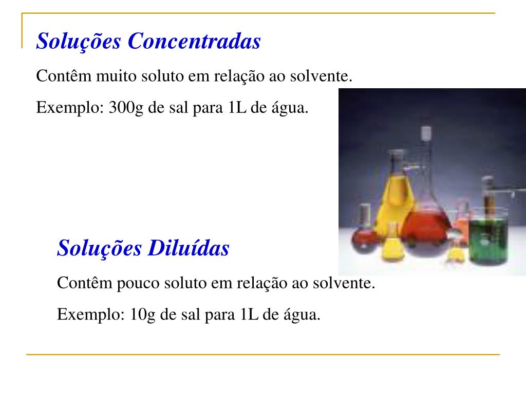 Soluções Concentradas Contêm muito soluto em relação ao solvente. Exemplo: 300g de sal para 1L de água. Soluções Diluídas Contêm pouco soluto em relação ao solvente. Exemplo: 10g de sal para 1L de água.