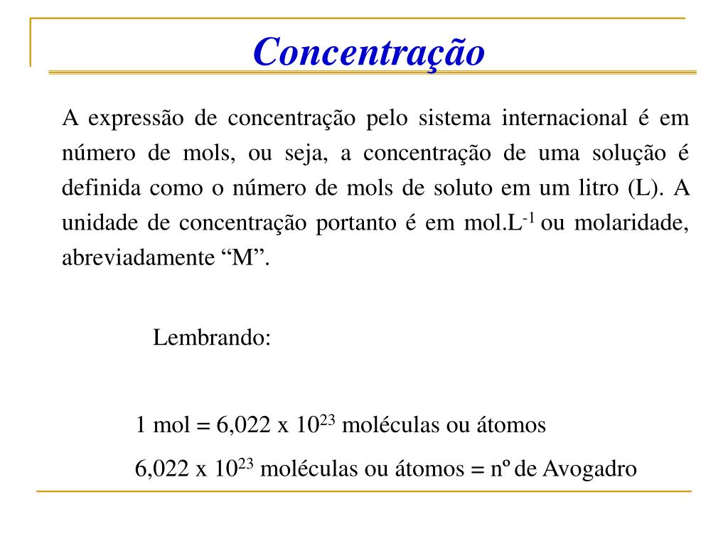 Concentração A expressão de concentração pelo sistema internacional é em número de mols, ou seja, a concentração de uma solução é definida como o número de mols de soluto em um litro (L). A unidade de concentração portanto é em mol.L-1 ou molaridade, abreviadamente “M”. Lembrando: 1 mol = 6,022 x 1023 moléculas ou átomos 6,022 x 1023 moléculas ou átomos = nºde Avogadro