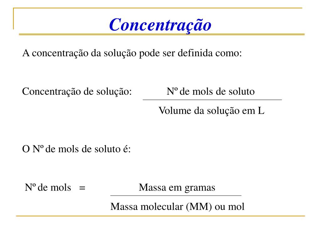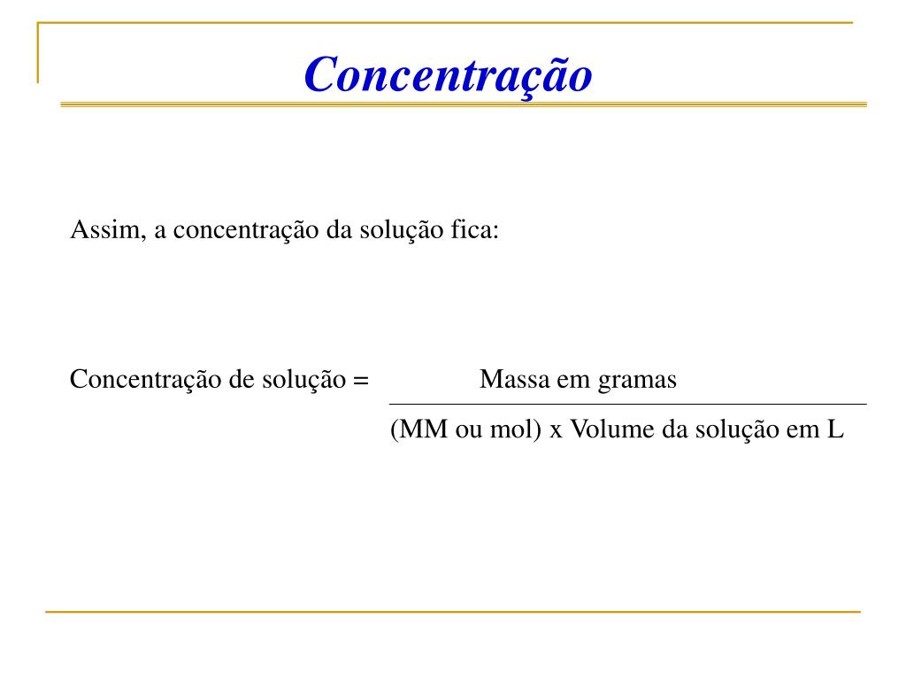 Concentração Assim, a concentração da solução fica: Concentração de solução = Massa em gramas (MM ou mol) x Volume da solução em L