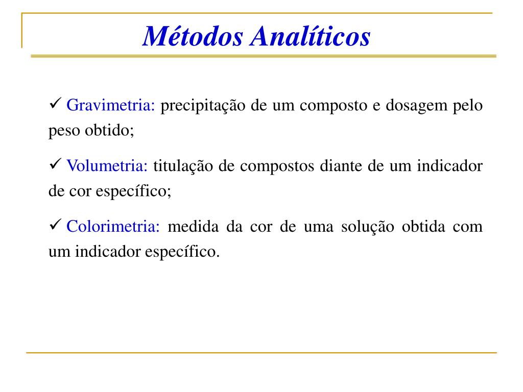 Métodos Analíticos • Gravimetria: precipitação de um composto e dosagem pelo peso obtido; • Volumetria: titulação de compostos diante de um indicador de cor específico; • Colorimetria: medida da cor de uma solução obtida com um indicador específico.