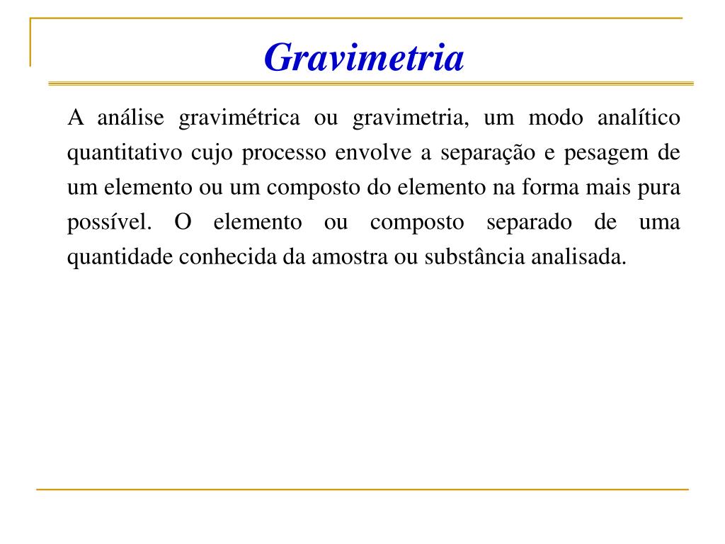 Gravimetria A análise gravimétrica ou gravimetria, um modo analítico quantitativo cujo processo envolve a separação e pesagem de um elemento ou um composto do elemento na forma mais pura possível. O elemento ou composto separado de uma quantidade conhecida da amostra ou substância analisada.