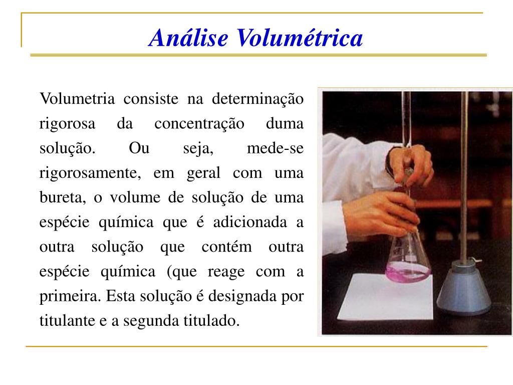 Análise Volumétrica Volumetria consiste na determinação rigorosa da concentração duma solução. Ou seja, mede-se rigorosamente, em geral com uma bureta, o volume de solução de uma espécie química que é adicionada a outra solução que contém outra espécie química (que reage com a primeira. Esta solução é designada por titulante e a segunda titulado.
